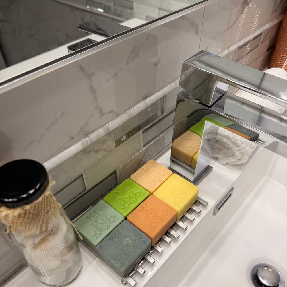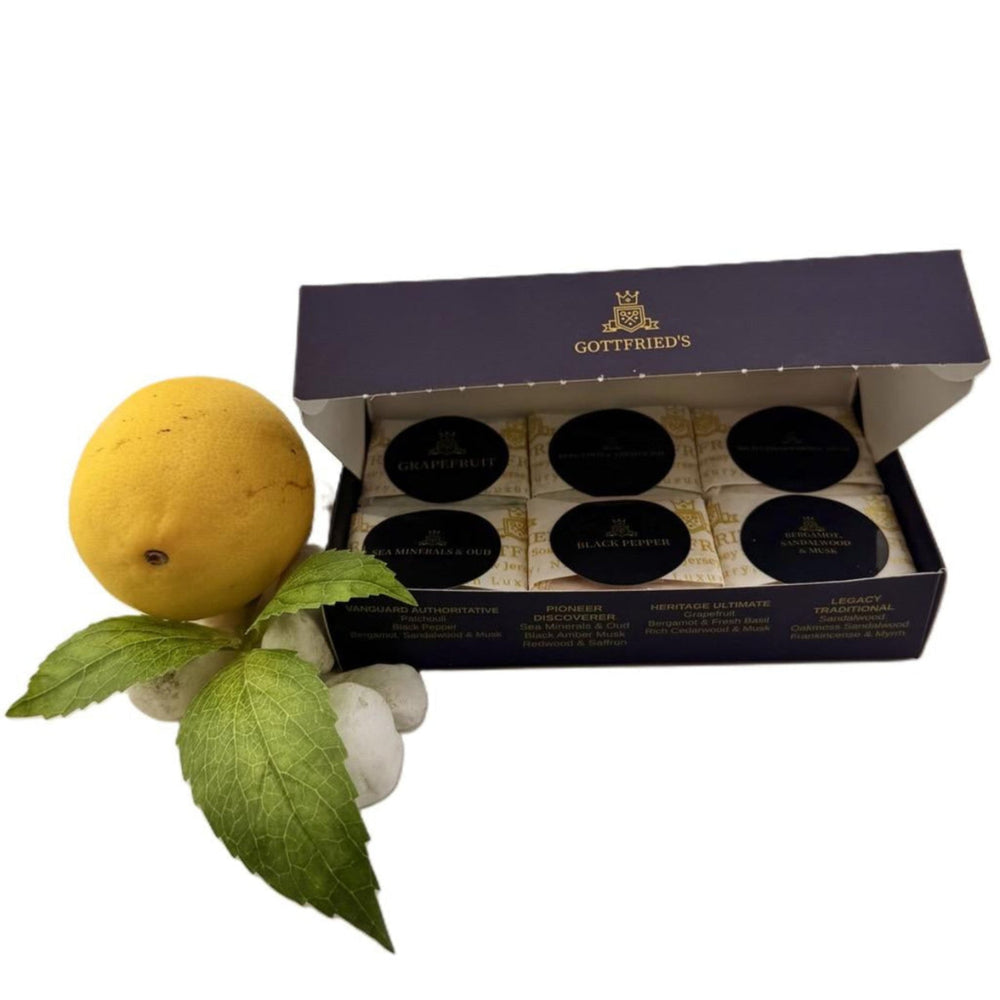 Bright citrus, cool herbs, and salt-tinged woods—clean, energizing, and never loud. Six travel-size cold-process bars made for everyday freshness.