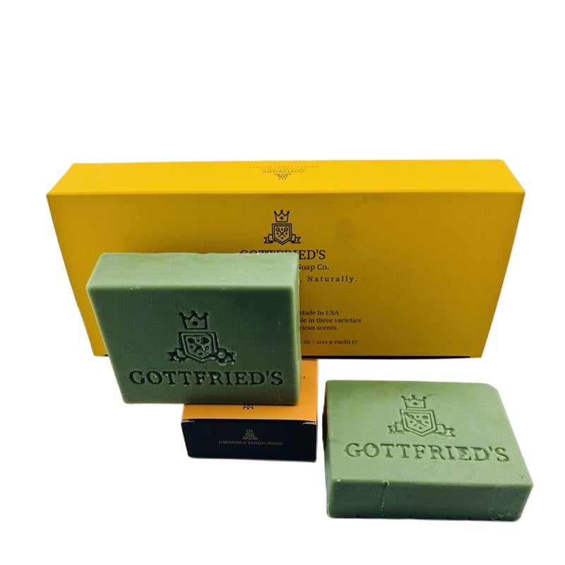 Earthy and grounding, Gottfried’s Oakmoss & Sandalwood Bar Soap for men blends two timeless notes into one sophisticated bar. Oakmoss brings a natural, green depth while sandalwood provides smooth warmth. Hints of tonka bean, cedarwood, lemon, and petitgrain round out the scent, creating a fragrance that is both complex and approachable. Handcrafted with natural oils, this soap produces a rich lather that cleanses and conditions the skin. Subtle yet commanding, Oakmoss Sandalwood is made for the man who values balance, depth, and timeless appeal.